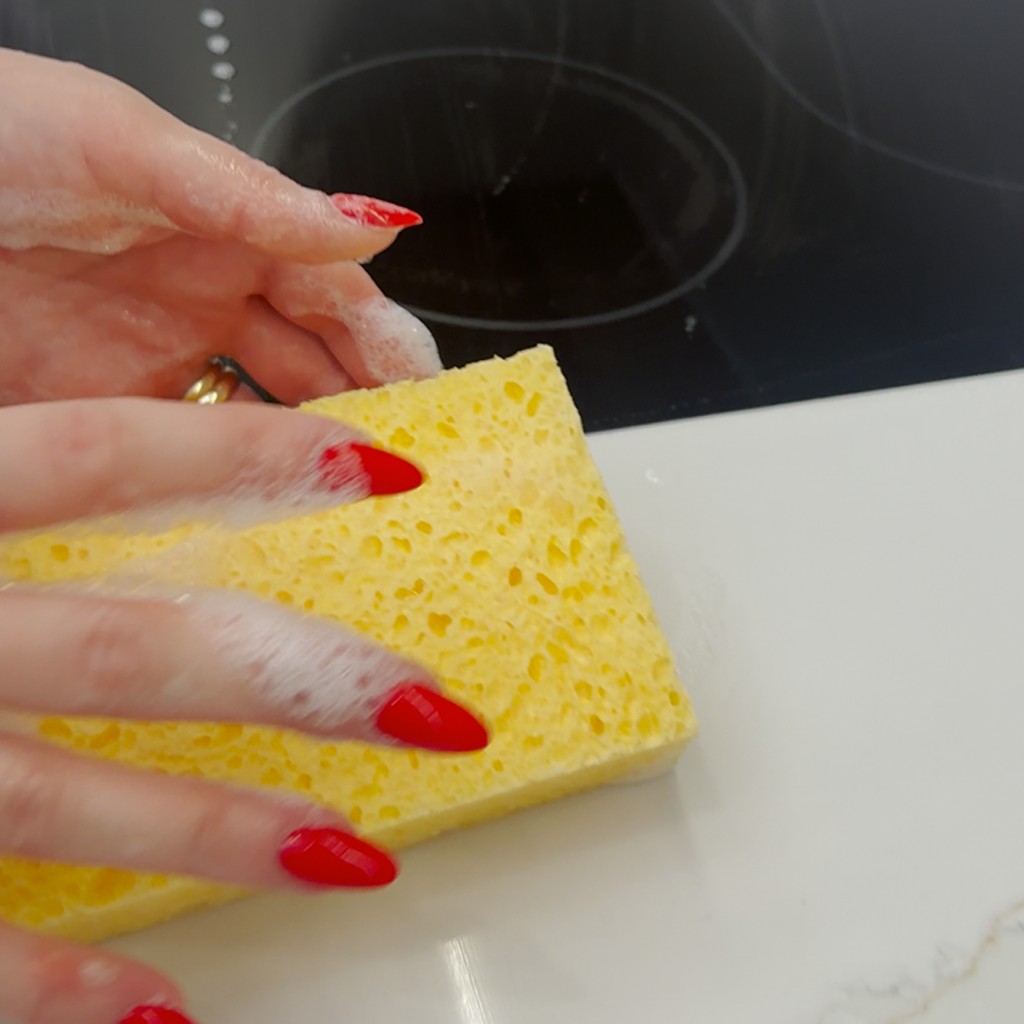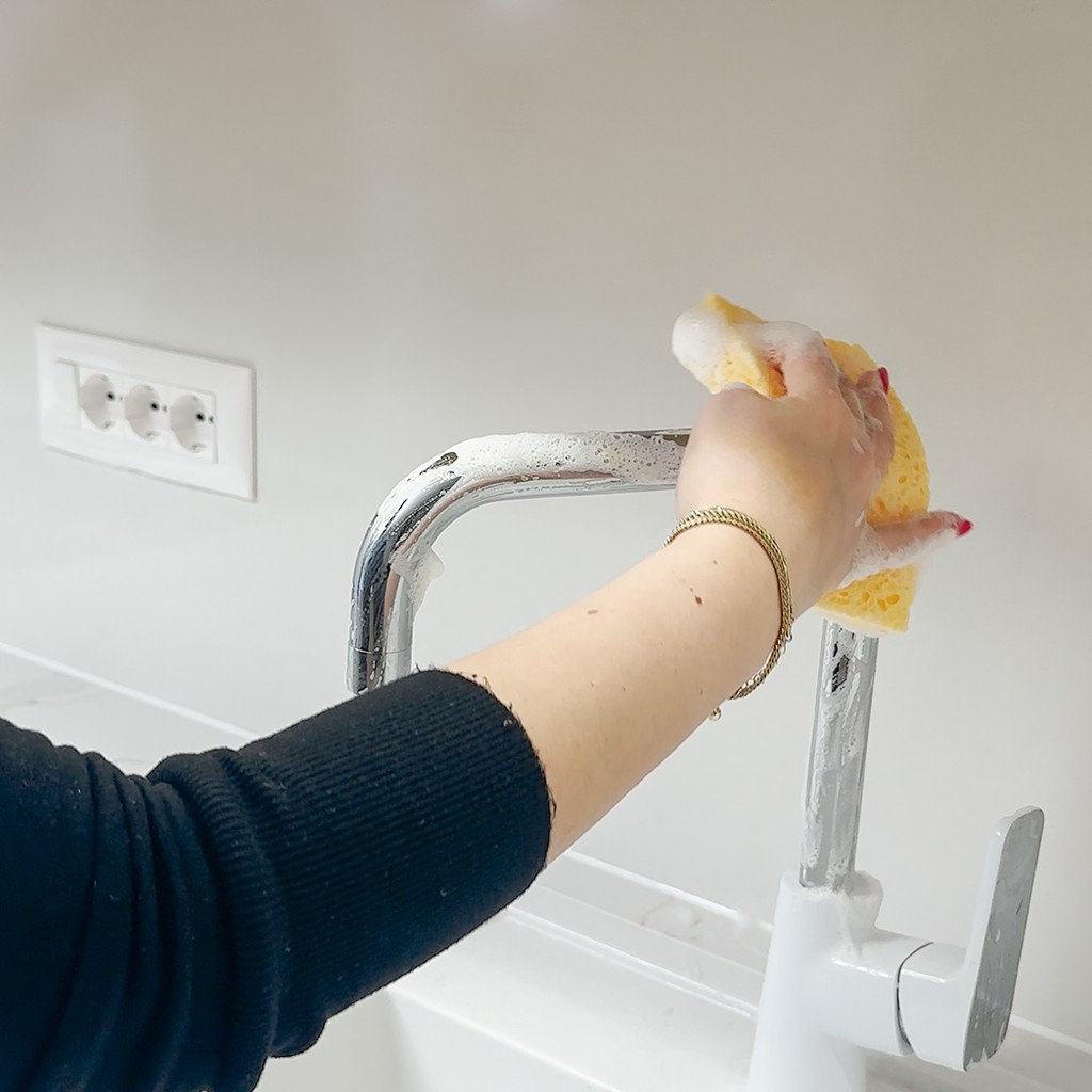 Spüle den Schwamm vor dem ersten Gebrauch und nach jeder Anwendung gründlich aus und drücke ihn gut aus. Verwende ihn nicht mit Bleichmitteln oder aggressiven Reinigern. Nach dem Trocknen einfach mit Wasser befeuchten – und schon ist er wieder einsatzbereit.