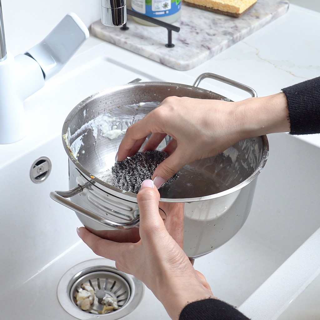 Dieser robuste Scheuerschwamm aus recyceltem Edelstahl ist die ideale Lösung für hartnäckige Verschmutzungen. Dank seiner spiralförmigen Struktur und dem abgerundeten Drahtquerschnitt reinigt er gründlich, ohne empfindliche Oberflächen zu beschädigen – perfekt für Küche, Grill und mehr.
